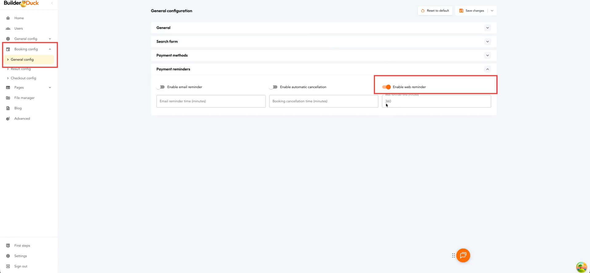Para activarlo dirígete a Configuración de Reservas y abre Configuraciones Generales. Allí verás la sección Recordatorios de Pago. Expande esa sección. Allí activa el swich Habilitar el recordatorio web.