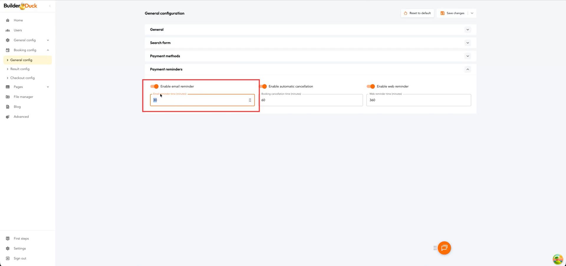 Builderduck permite enviar recordatorios para que los usuarios completen reservas iniciadas con medios de pago online que no fueron finalizadas, tanto con un pop-up dentro de la web como correo electrónico.