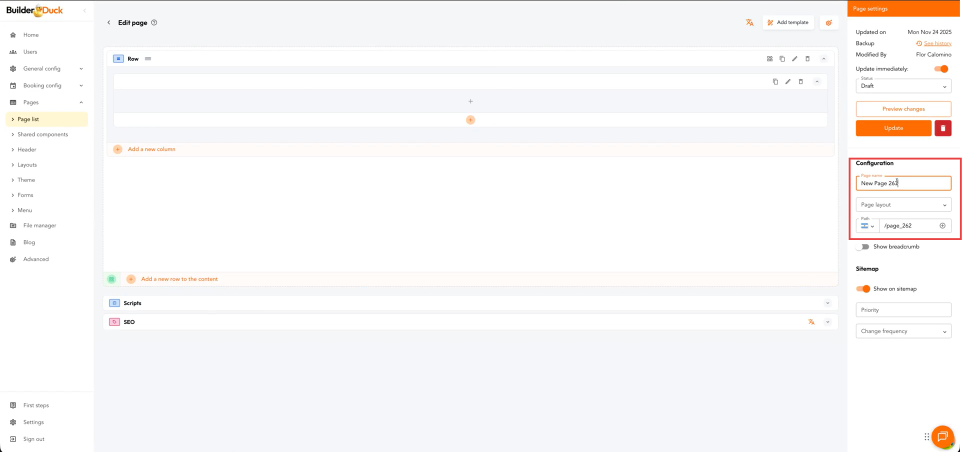 En la barra lateral suma el nombre de la página, elige el layout y escribe la ruta de acceso en sus respectivos campos.