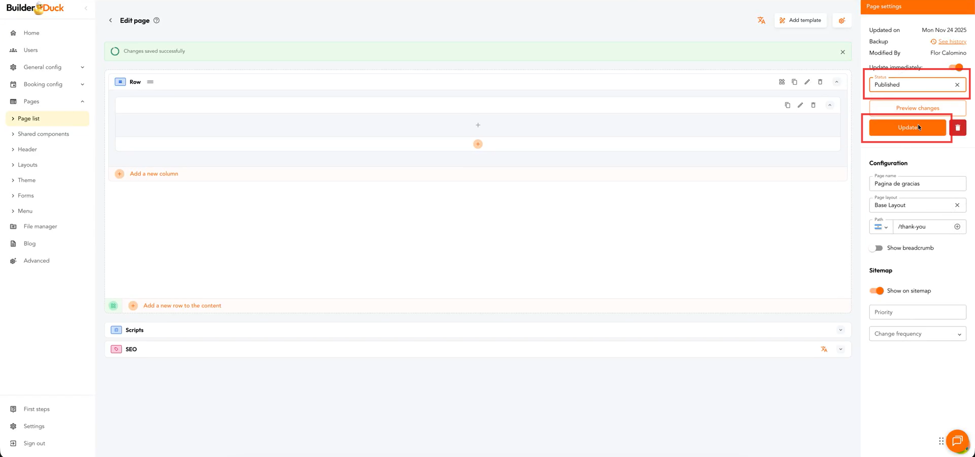 Luego publica la página. Para ello, selecciona Publicar en el menú desplegable y presiona el botón Actualizar.