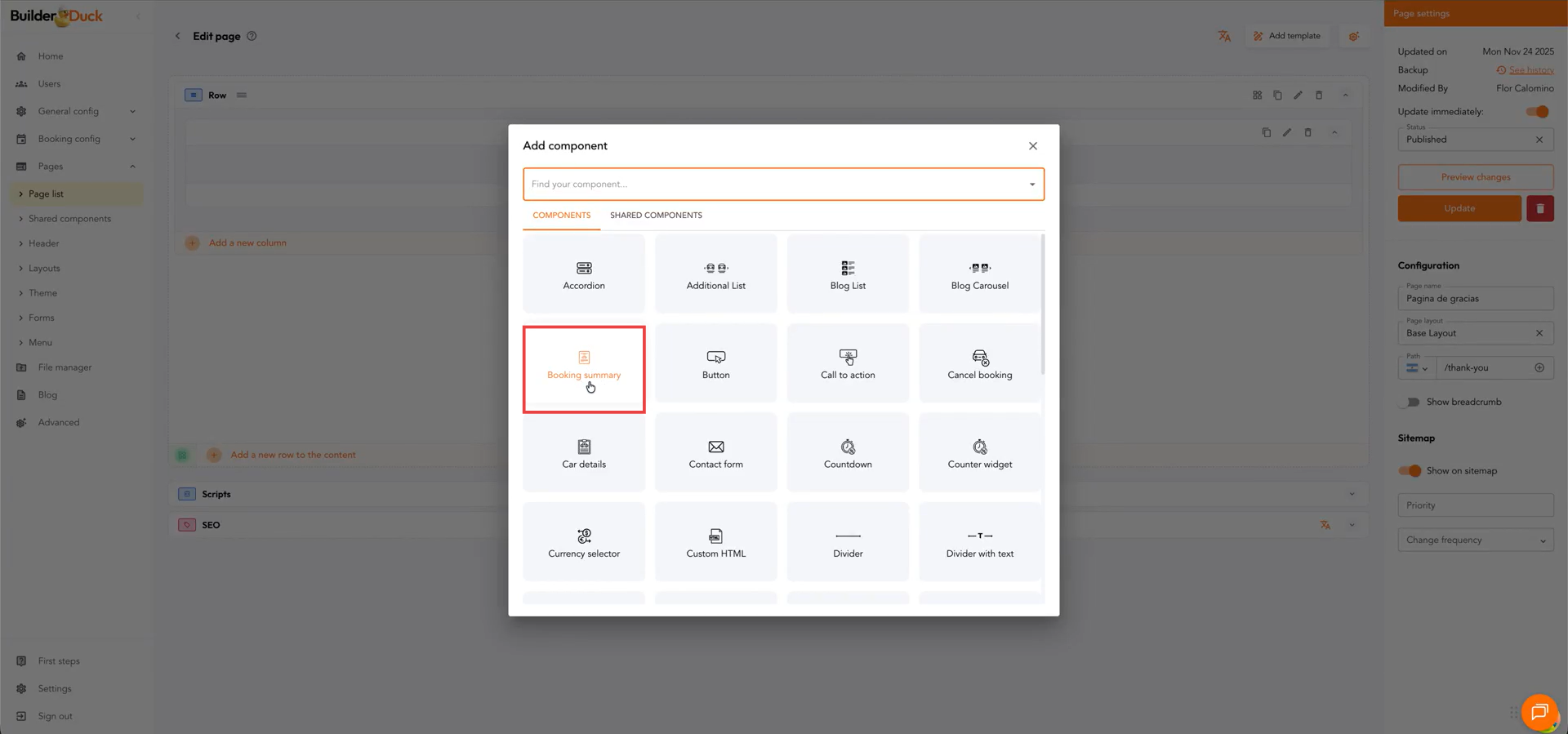 Builderduck permite crear una página de agradecimiento personalizada cuando el usuario completa una reserva. El sistema toma automáticamente los datos y muestra el detalle de la operación realizada.