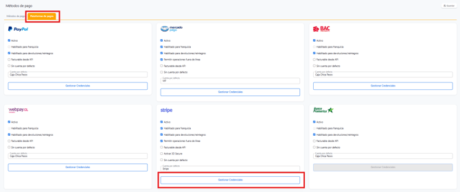 2_ Seleccionar el método de pago Stripe y hacer click en gestionar credenciales