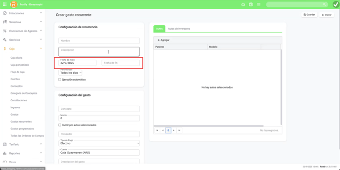 Debajo selecciona la fecha de inicio del gasto recurrente. También puedes seleccionar la fecha de fin (pero es optativo). En caso de no seleccionarse fecha de fin, el sistema lo marcará como un gasto continuo.