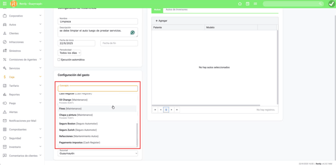 Con Rently puedes crear gastos recurrentes y definir cada cuánto se ejecutará de forma automática. Asocia los gastos a uno o más autos, define el tipo de pago y decide si quieres que se procese automáticamente en caja o si prefieres que sea manual.