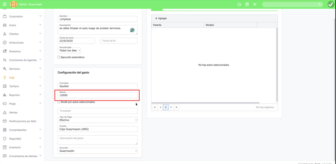 Por último, agrega los autos a los que les quieras asociar el gasto recurrente. Simplemente, presiona el botón Agregar y luego selecciona la patente del auto. Se puede agregar más de un auto al gasto recurrente.