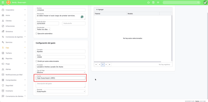 Debajo podrás marcar si quieres que se ejecute el gasto automáticamente en la caja. En caso de no marcarlo, eso deberá hacerse manualmente.