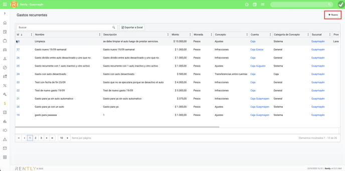 Para crear un gasto recurrente ve a Caja y selecciona Gastos Recurrentes. Luego, selecciona Nuevo.
