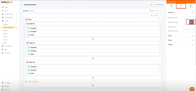 In the side menu, open the Styles tab. Expand the Background submenu and you’ll find Background Image. Click there to select the image that will appear on the first slide of your carousel.