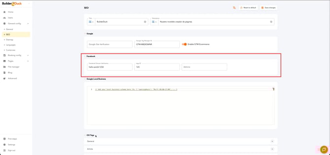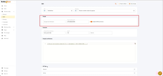 Add the title and description to your website created with BuilderDuck. Include Google Tags, GTM Ecommerce, Google My Business, and OG tags.
