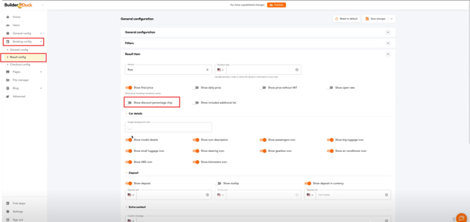 To hide the discount percentage in bookings, go to Booking Configuration in the sidebar and open Results Configuration. There, expand Result Items and turn off the switch Show discount percentage chip.