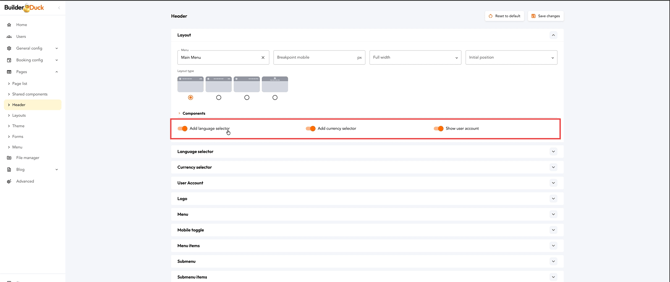 If your webpage supports multiple currencies or languages, you can enable their display in the header by activating the respective switches.