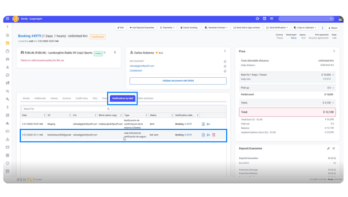 To see the emails sent, go to the details section and press the Notifications by Emails tab. There, you will find the Axle Insuranse Verification Request.