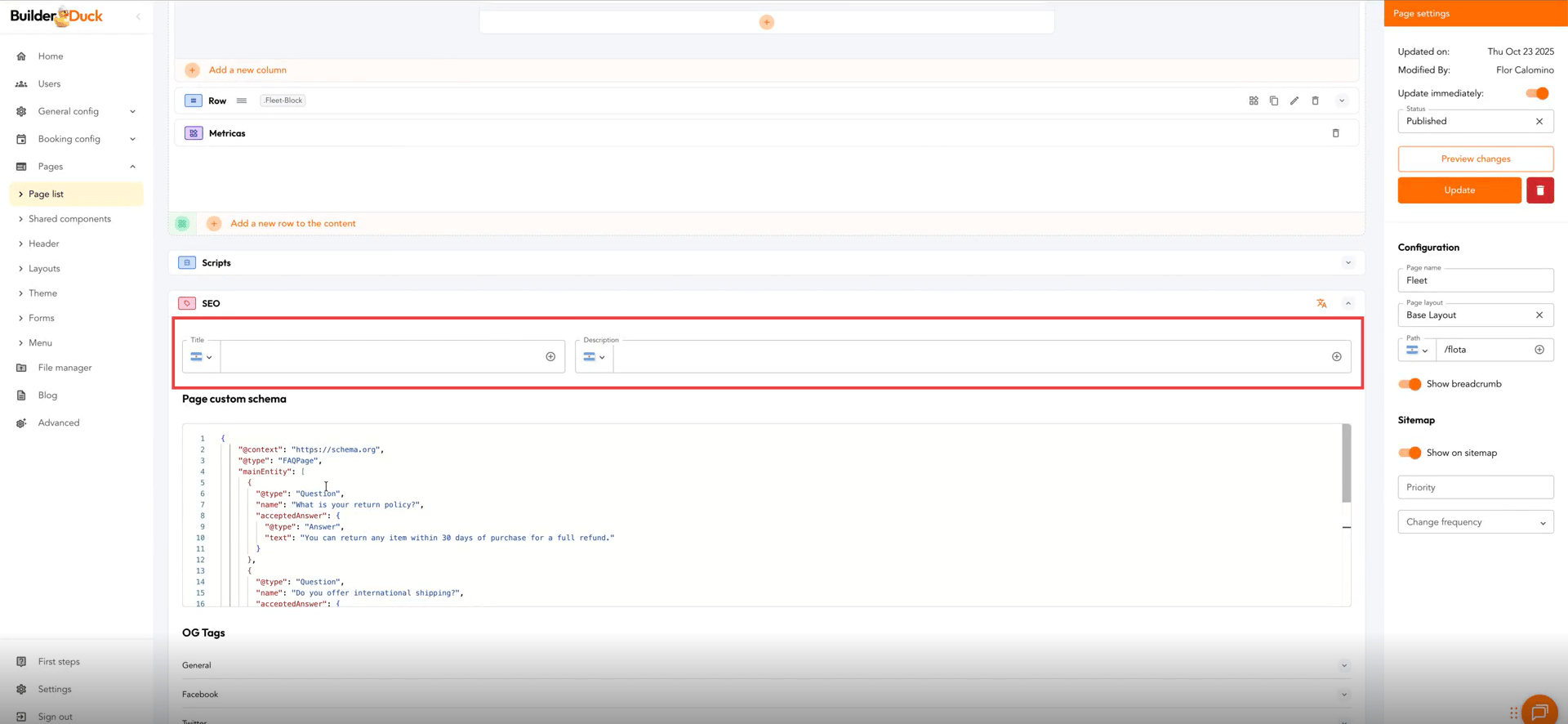 In the list of pages, select the one where you want to add OG Tags (General, Facebook, or Twitter) as well as a custom schema.