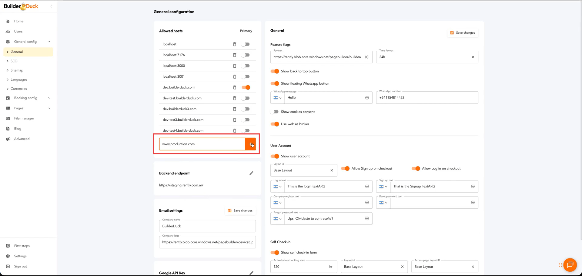 There, you’ll see the allowed domains (initially, these will be Builderduck’s domains).