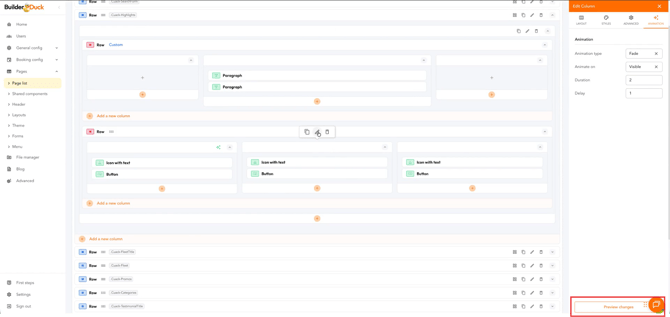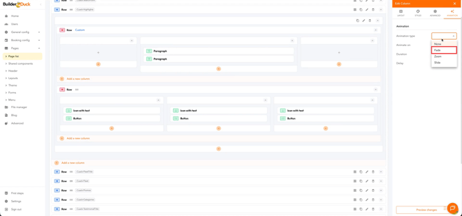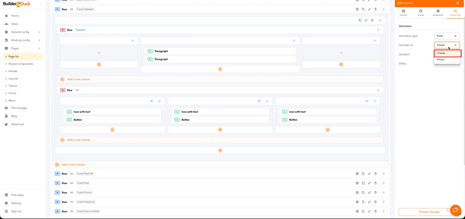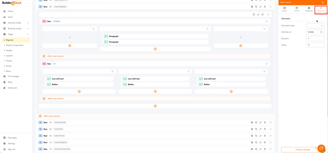 Com o Builderduck, você pode adicionar animações aos diferentes componentes do seu site, escolhendo quando e por que elas começam, bem como sua duração.
