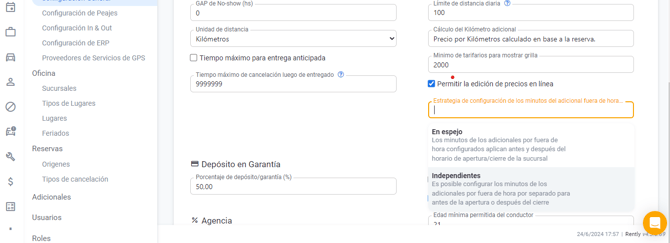 Nas configurações gerais, em "Configurações de Reserva", você encontrará a opção "Estratégia de Configuração de Minutos Adicionais Fora do Horário Comercial".