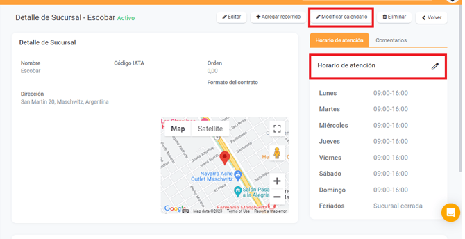 Depois de navegar até o perfil da filial onde você deseja atribuir a taxa extra, selecione a opção "Modificar Calendário" ou "Horário Comercial".