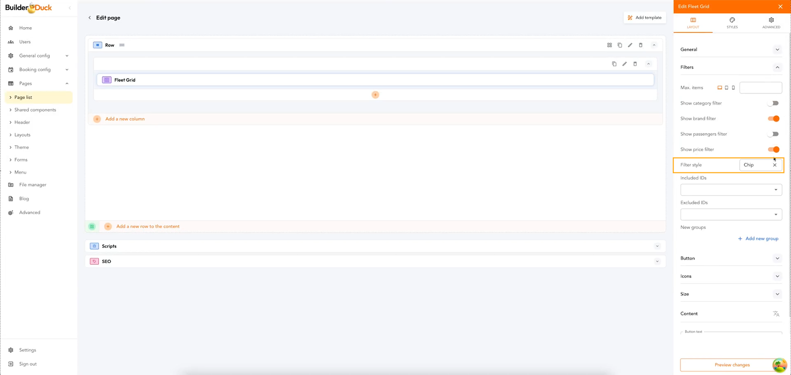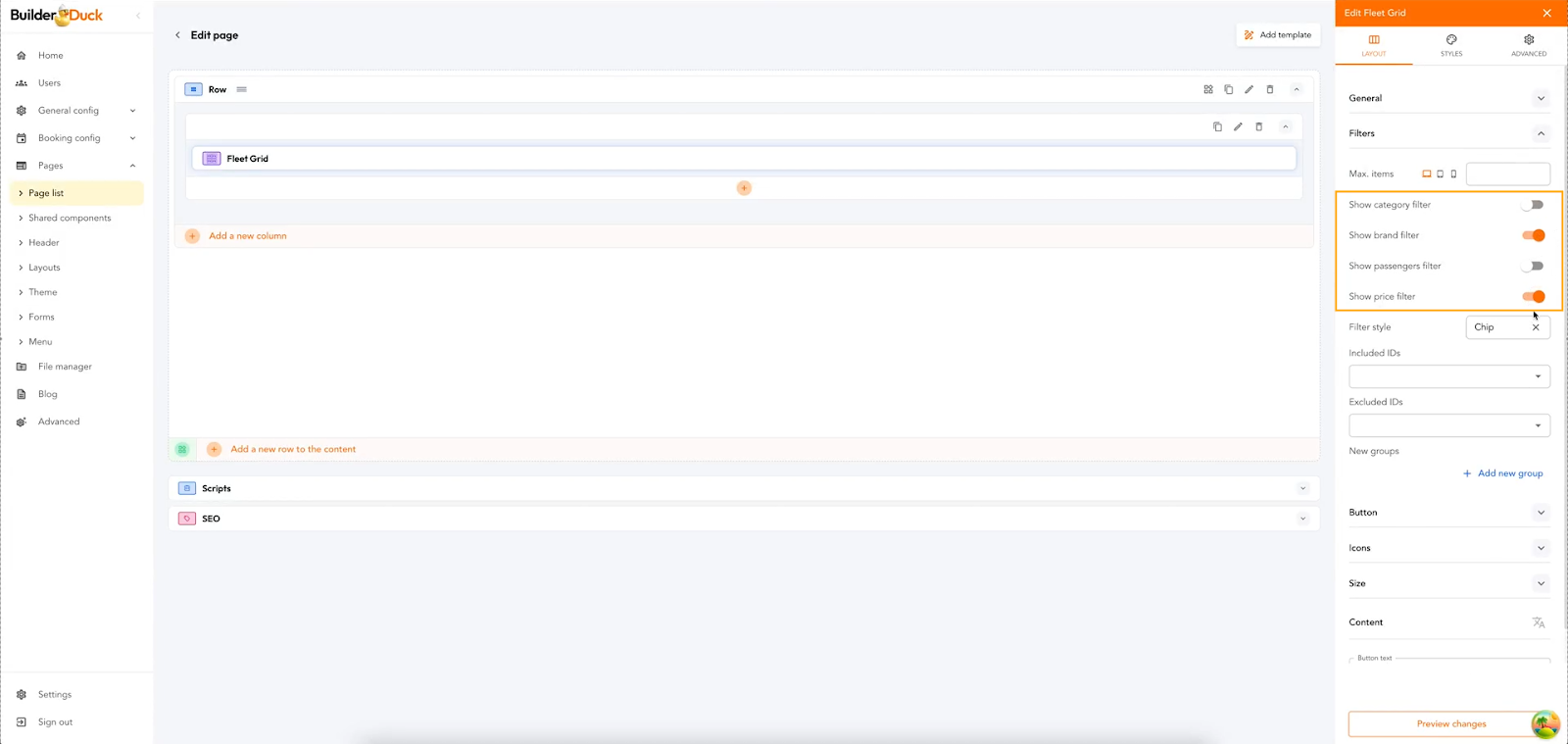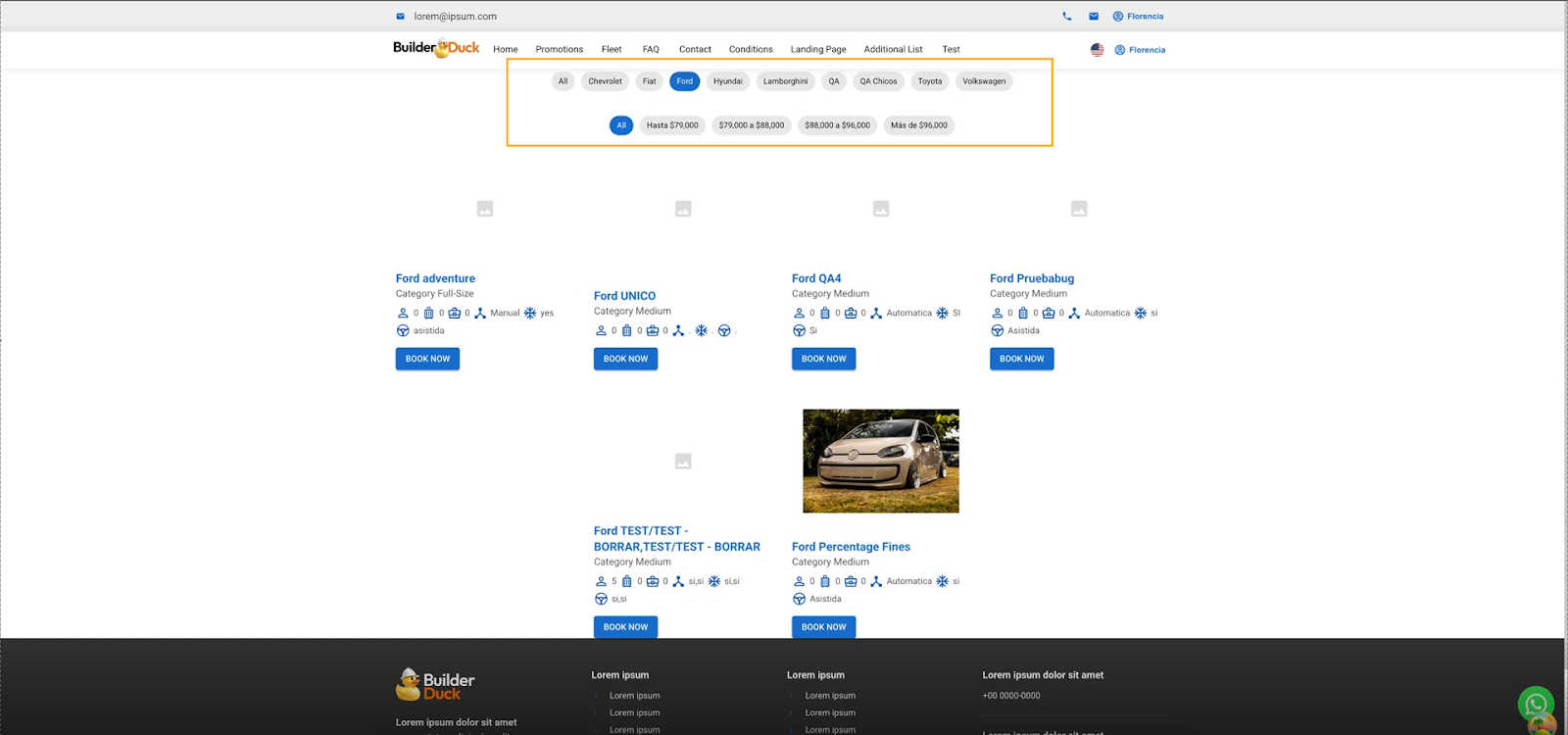 Adicione filtros por categoria, marca, passageiros e preço à sua página de frota. Escolha o estilo do filtro.