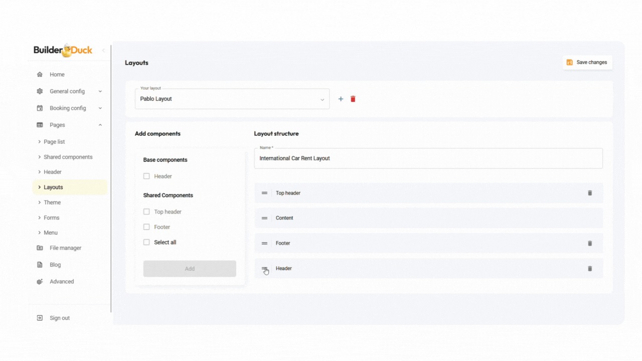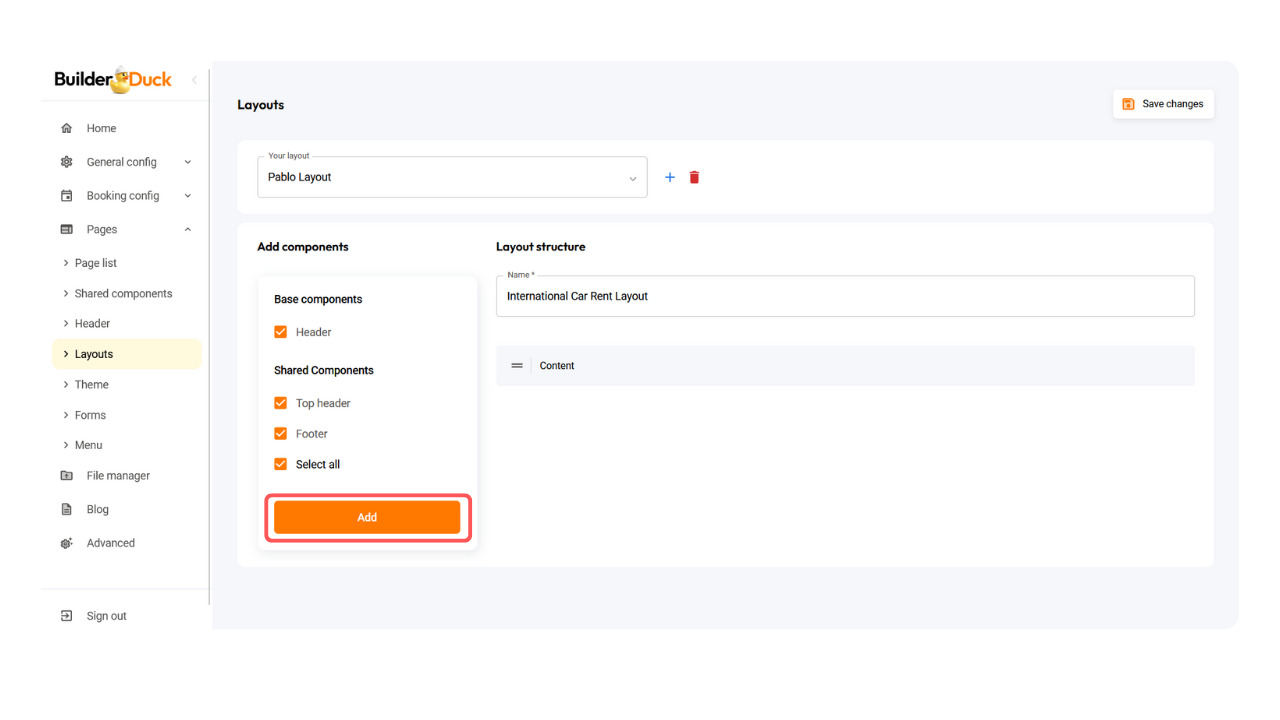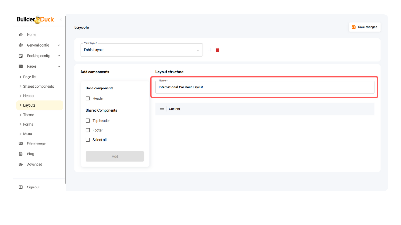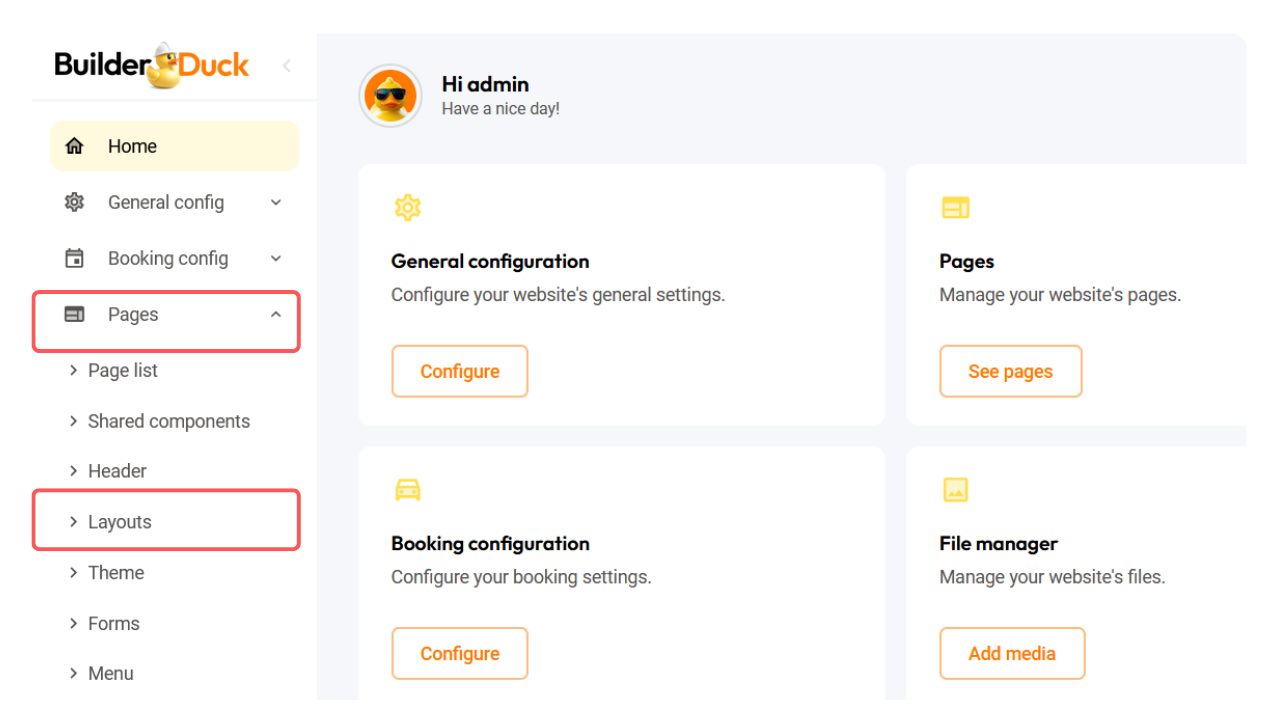 Com o BuilderDuck, você pode personalizar layouts predefinidos. Para fazer isso, acesse 'Páginas' na barra lateral e clique em 'Layout'.