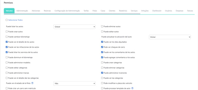 Lembre-se de que as permissões estão divididas por categorias (Carros, administração, adicionais, etc.).