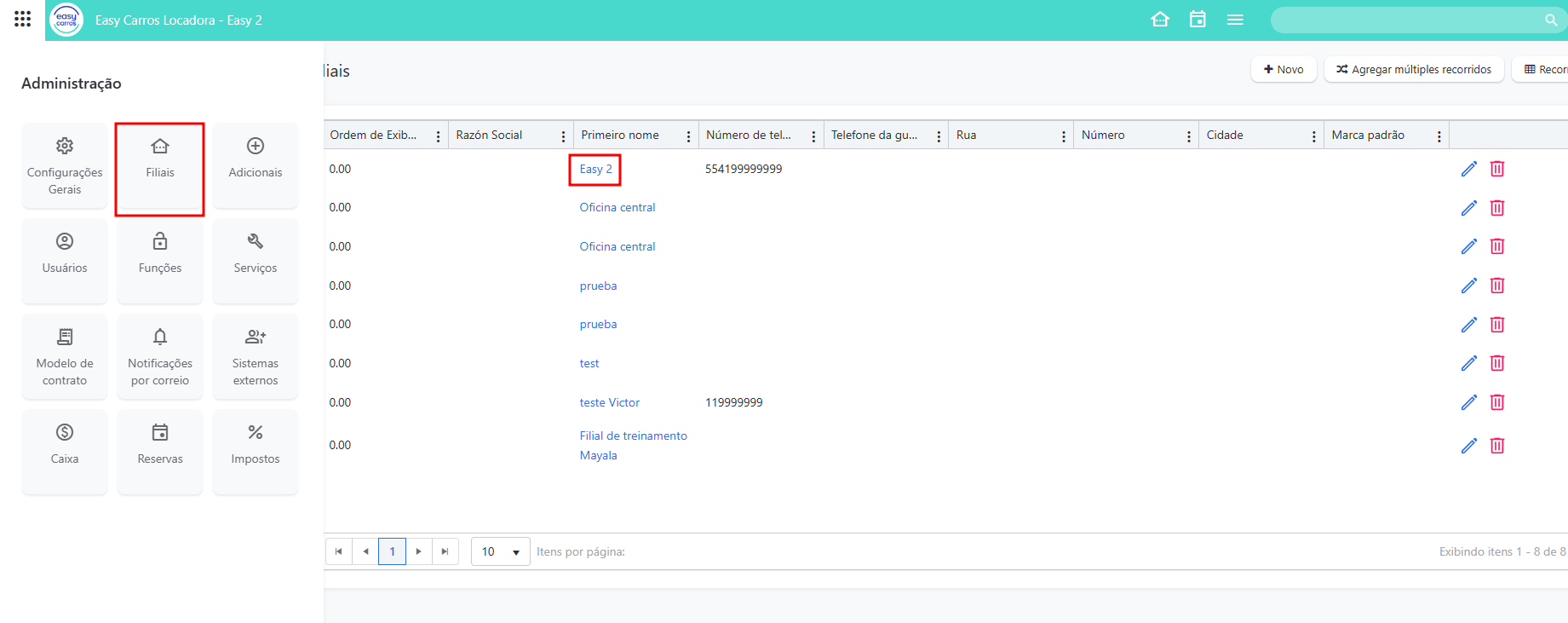 - Acesse a filial que precisa ser modificada clicando no nome da filial.