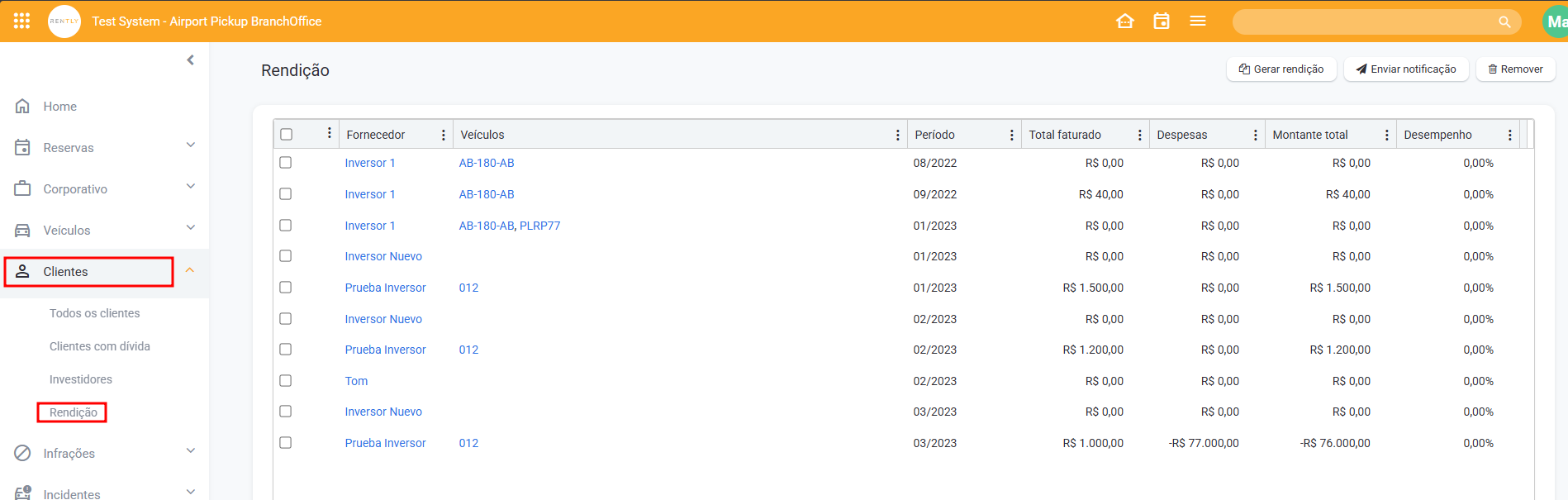 Em seguida, você poderá acessar a lista de Clientes - Investidores e clicar em cada Investidor para gerar a prestação de contas. Ou clicar em Gerar Prestações de Contas e definir o período.