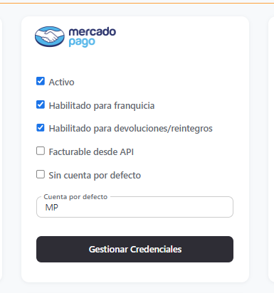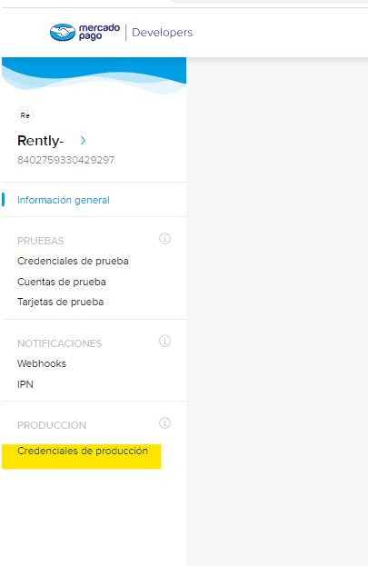Após obter essas informações, acesse "Métodos de pagamento" no Rently: TENANT.rently.com.ar/Cash/PaymentMethods, encontre o painel do Mercado Pago e clique em "Gerenciar credenciais".