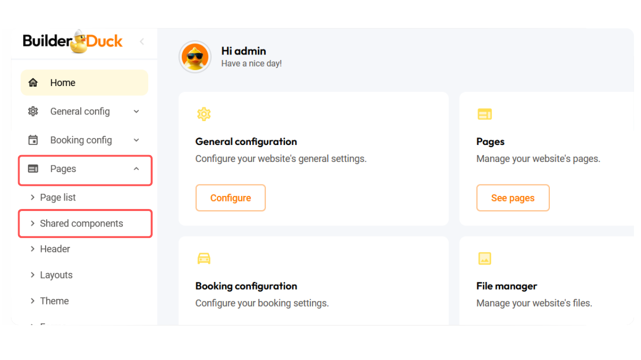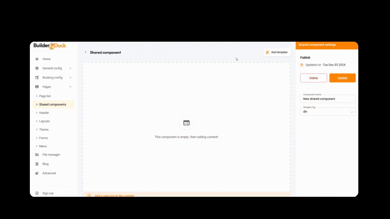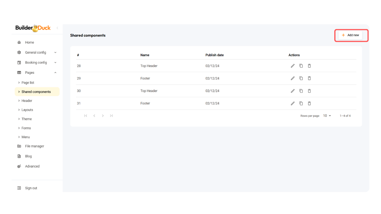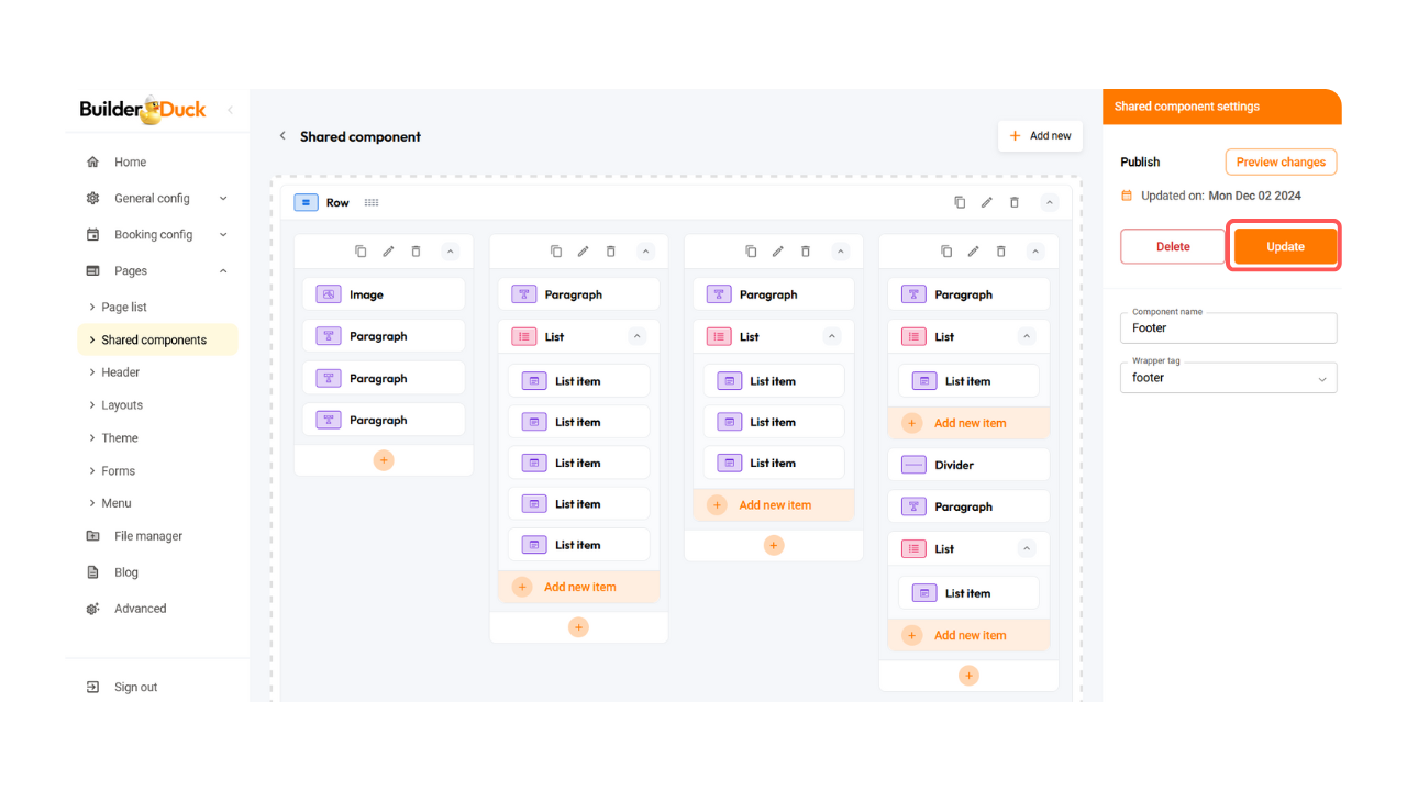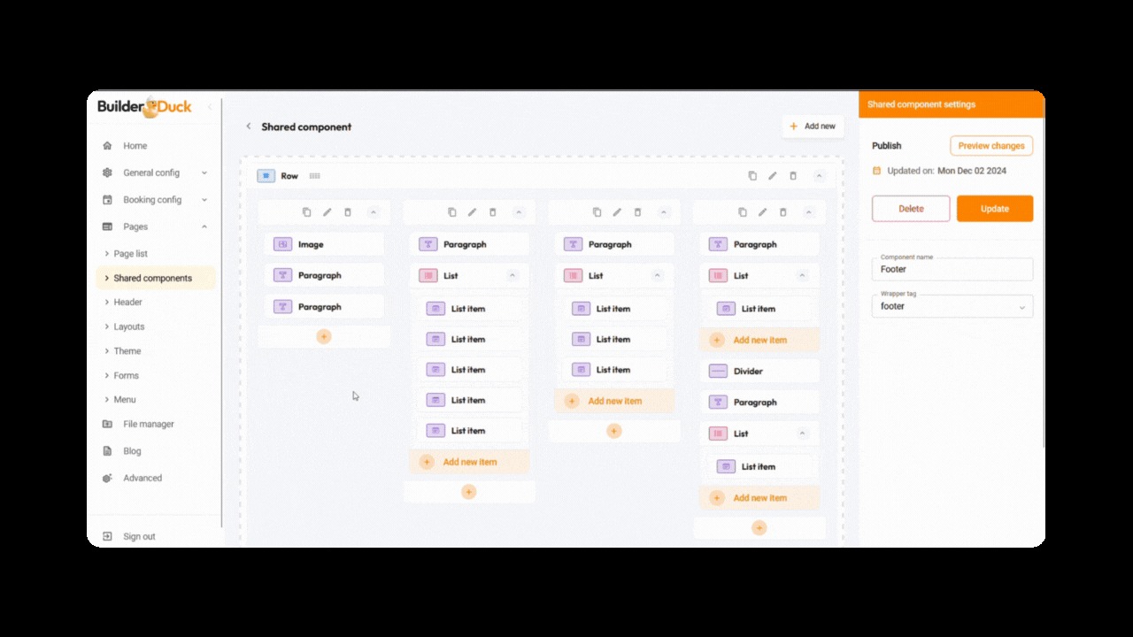 Com o BuilderDuck, você pode adicionar componentes compartilhados, como diferentes rodapés ou cabeçalhos.