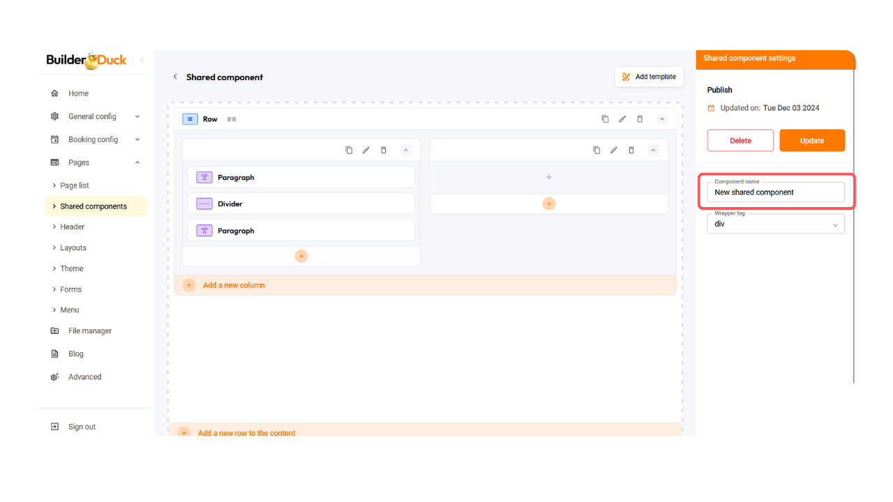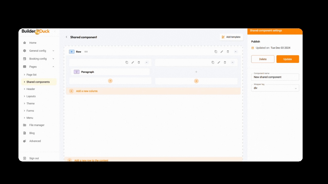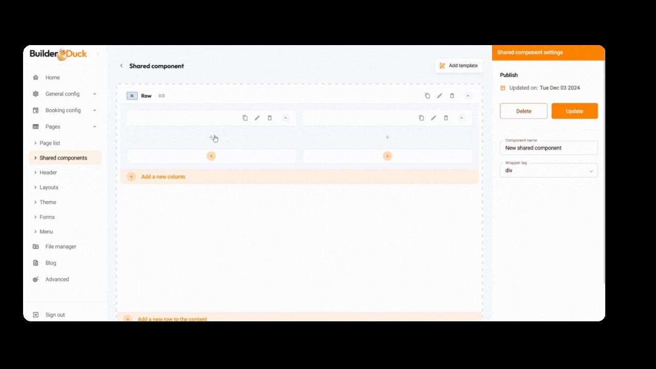 Ao editar uma página com o BuildDuck você pode criar um componente compartilhado a partir de uma seção ou coluna e reutilizá-lo em outras páginas.