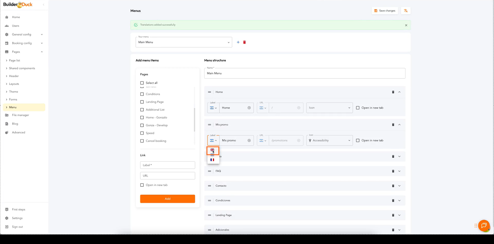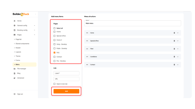 Aqui, você encontrará todas as páginas que criou no BuilderDuck. Para adicionar o acesso a essas páginas ao menu de navegação, você deve selecioná-las nessa lista e, em seguida, clicar no botão “Adicionar”.