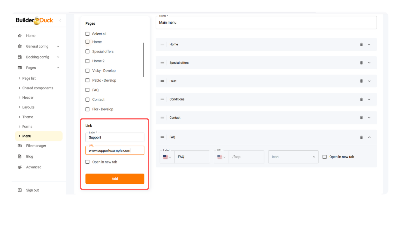 Para adicionar uma página externa ao seu menu, como um portal de suporte, insira o nome e a URL nos campos correspondentes. Em seguida, clique em “Adicionar”.