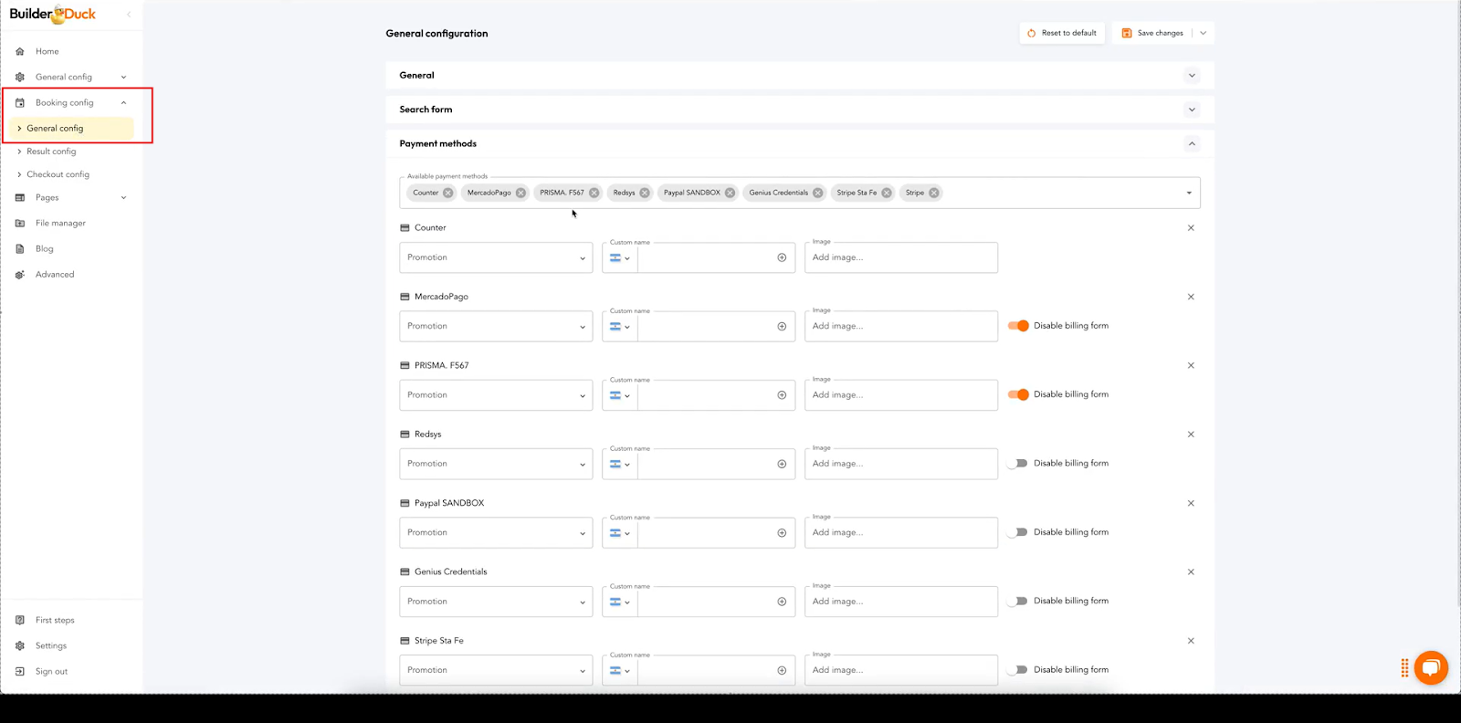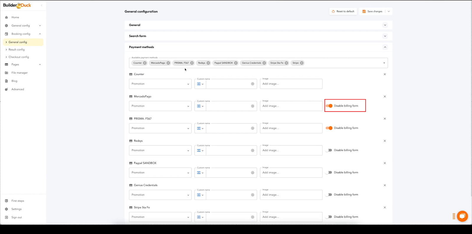 Com o BuilderDuck, você pode desativar a obrigatoriedade de preencher o formulário de faturamento que segue o formulário de reserva (ou check-out). Você pode desativá-lo para todos os seus métodos de pagamento ou apenas para alguns.