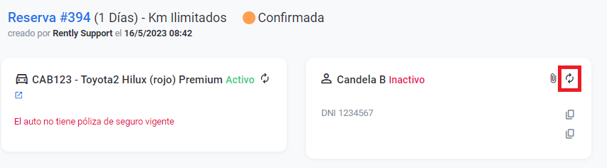 Se eliminou um cliente atribuído a uma reserva confirmada, poderá alterar o cliente na reserva selecionando o ícone das duas setas.