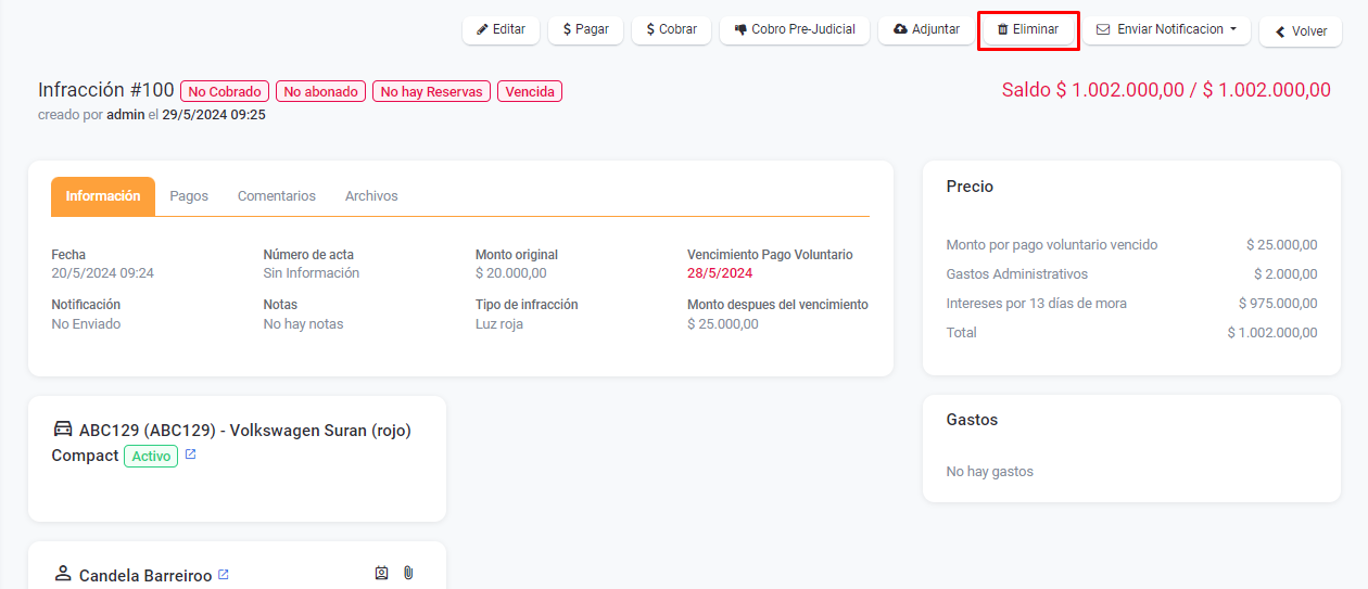 Como faço para excluir uma Infração? 1. Na grade "Todas as Infrações", selecione a violação que deseja excluir. 2. Dentro da infração, você verá o botão "excluir". 3. Se você clicar em "excluir", a infração será apagada. Atenção: Infrações que possuam registro de cobrança e/ou pagamento NÃO PODEM SER EXCLUÍDAS.