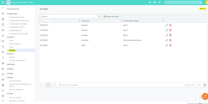 Como configurar feriados | Central de Ajuda da Rently 1. Acesse Filiais > Feriados. Selecione "Novo". 2. Preencha as informações solicitadas. - Se é um feriado único ou vários feriados- Data do feriado- Descrição do feriado- Filiais afetadas pelo feriado Lembre-se sempre de salvar suas alterações.