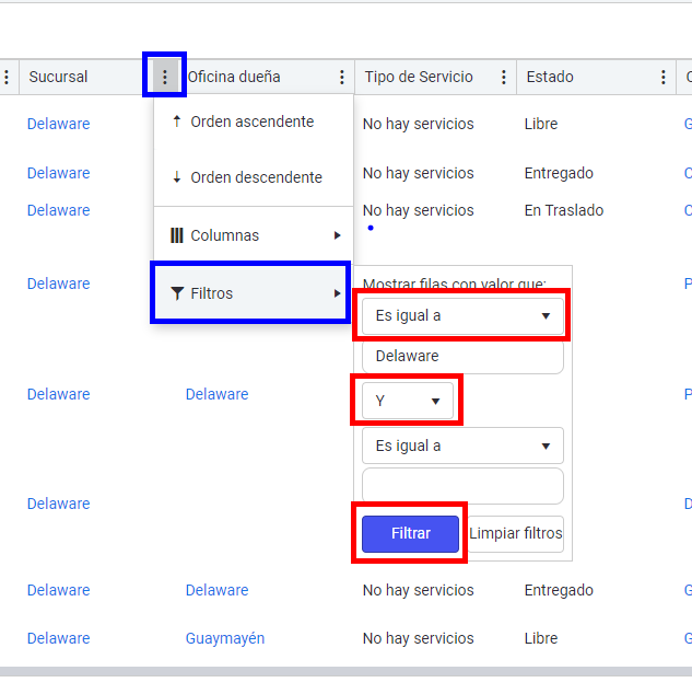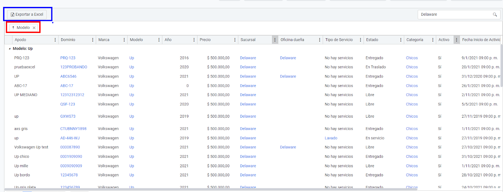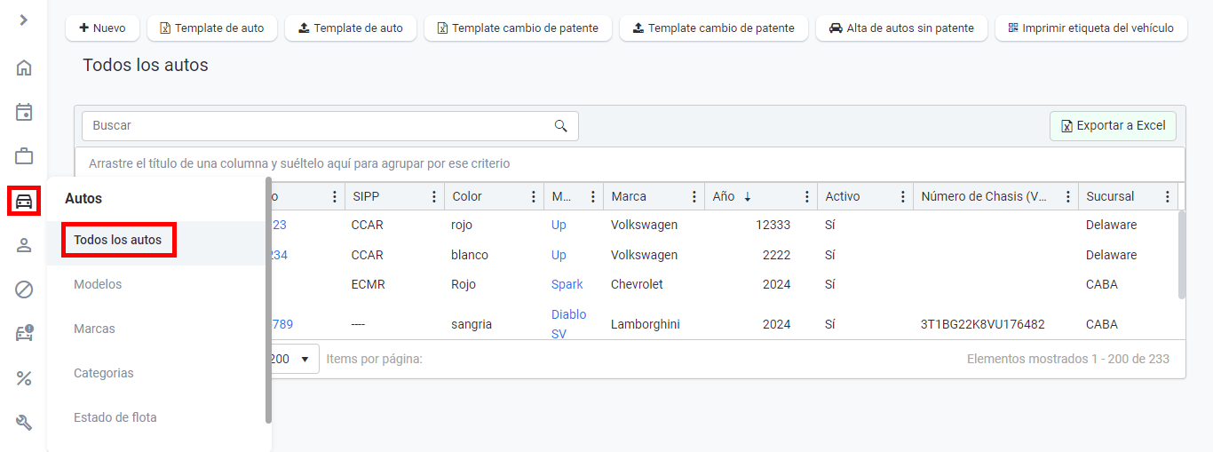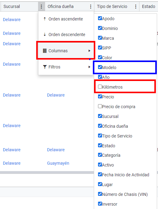 2. Por padrão, você verá todos os carros da filial em que está localizado. Para filtrar por filial, acesse a coluna "Filial" > "Filtros" > filial desejada > "Filtrar".