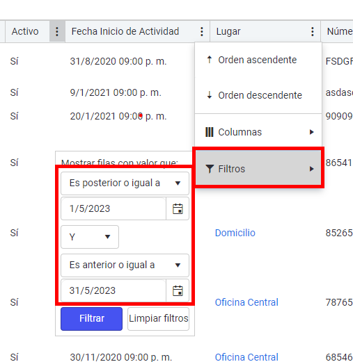 Por exemplo, se você quiser filtrar por datas em maio, você deve inserir "É posterior ou igual a" + "E" + "É anterior ou igual a" e clicar em "Filtrar".