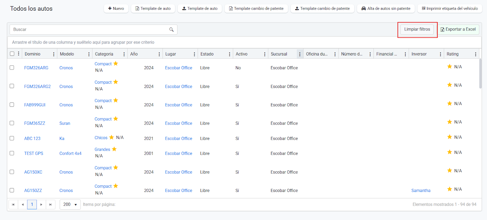 3. Se precisar visualizar todos os carros de todas as filiais, você pode "Limpar filtros".
