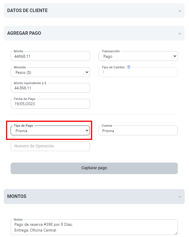 - Ao efetuar um pagamento ou depósito para uma reserva, selecione a opção "Prisma" como forma de pagamento.