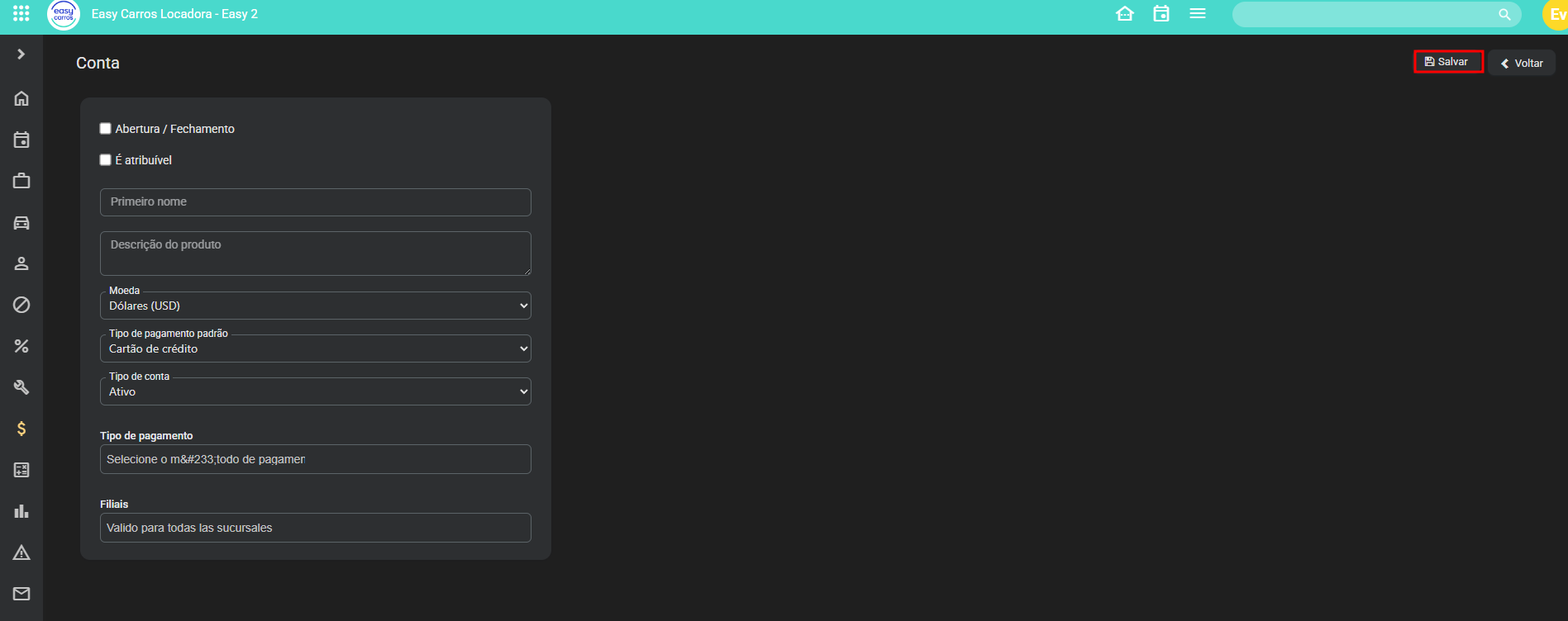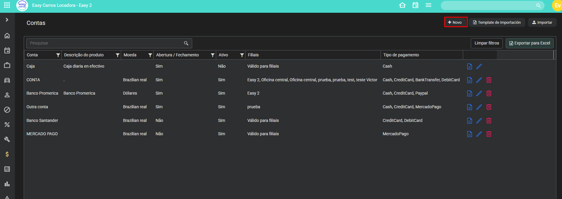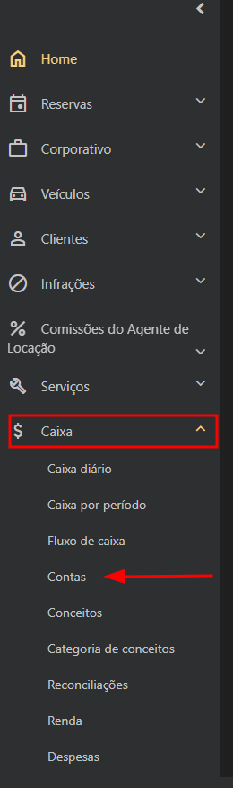 Como criar uma nova conta | Centro de Ajuda Rently No menu “Caixa”, selecione a opção “Contas”. No canto superior esquerdo, selecione a opção “NOVO”. Preencha os dados conforme necessário e clique em “SALVAR”.