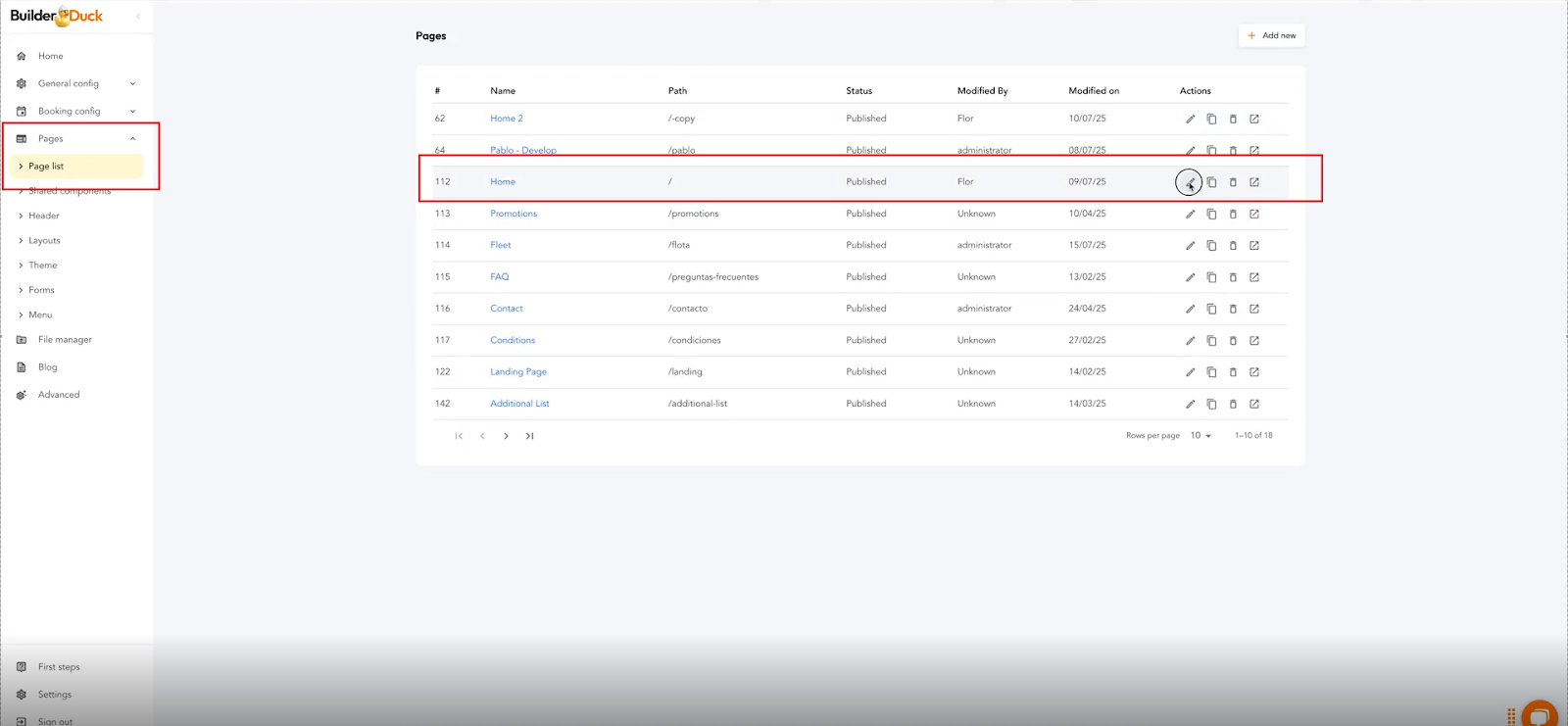 Para adicionar um link de cancelamento de reserva à sua página da web, vá para Páginas e selecione Lista de Páginas. Lá, encontre a página inicial e pressione o botão Editar.