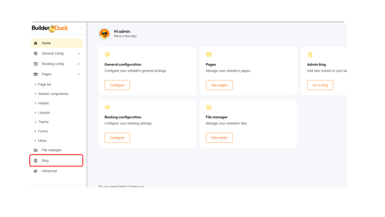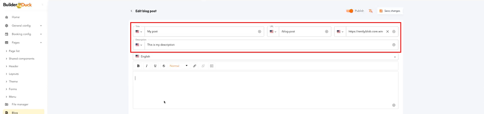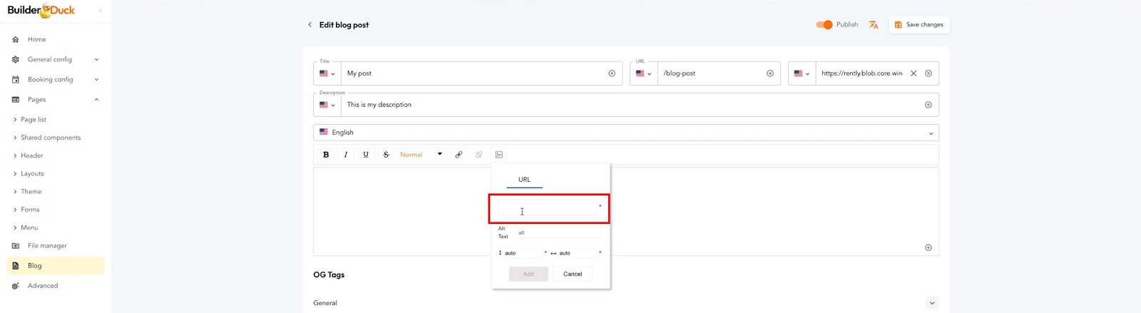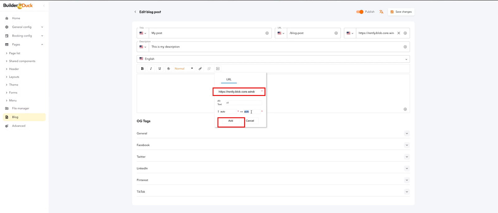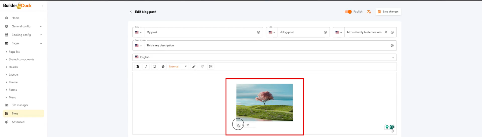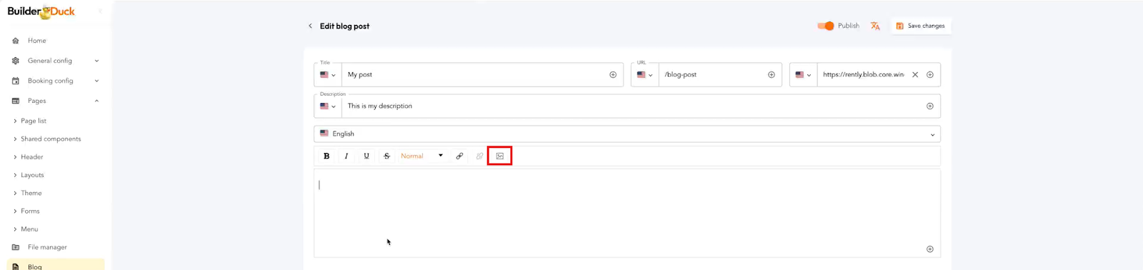 Para adicionar uma imagem à descrição da sua postagem no blog, você precisa primeiro fazer o upload da imagem para o BuilderDuck.