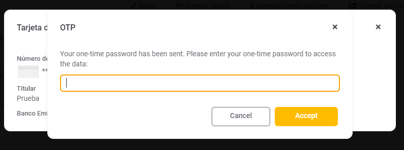 Para visualizar os dados de um cartão, o sistema solicitará um código de segurança único. Este será enviado ao clicar em «ver» (ícone do olho) no e-mail que o utilizador tiver configurado.