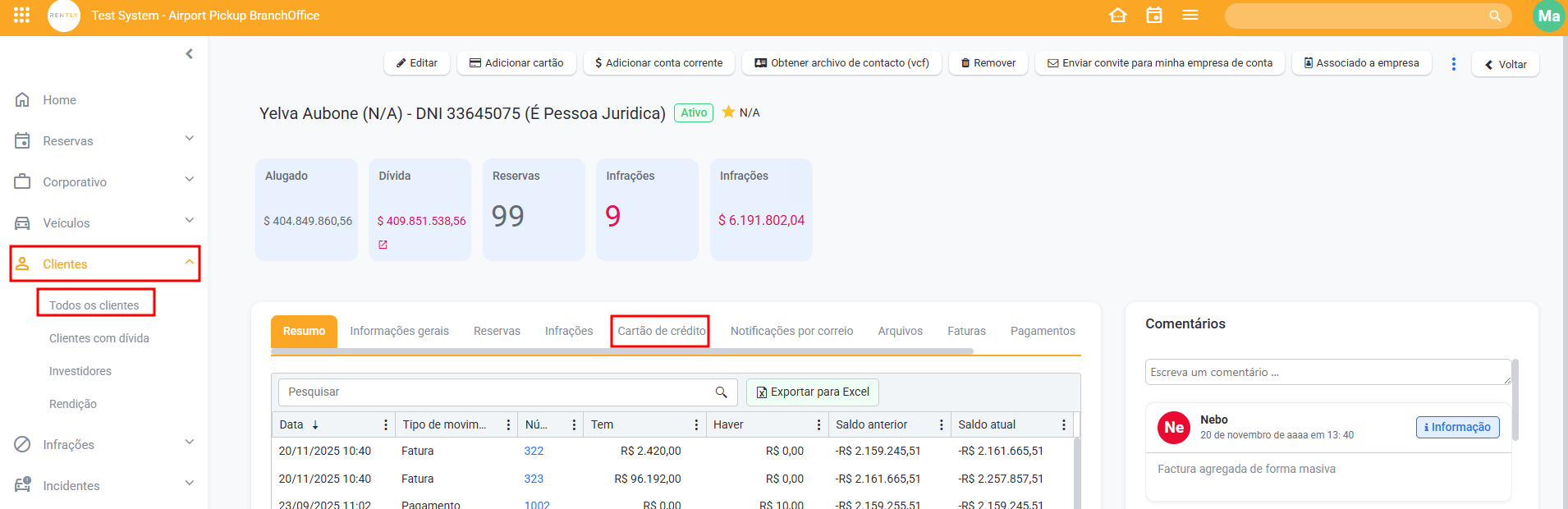 Caso tenha a permissão habilitada, para poder ver os dados, primeiro devemos ir em “Clientes” - “Todos os clientes” e clicar em Cartão de Crédito.