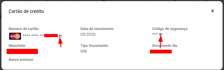 Apenas os utilizadores cuja função tenha a permissão “Pode ver cartão de crédito” estarão habilitados a ver os dados.