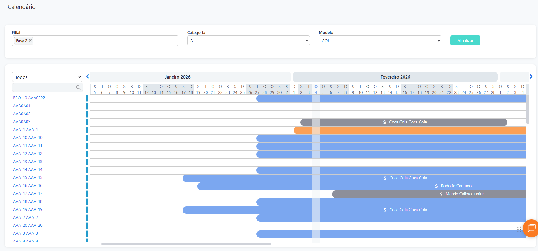 2. Uma vez lá, o calendário que aparecerá já terá por padrão todas as filiais com todos os seus carros.