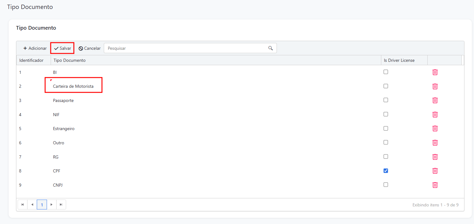Ao clicar em “Adicionar”, aparecerá uma linha para escrever e lá você colocará o tipo de documento que deseja, depois clique em “Salvar”.
