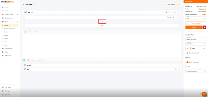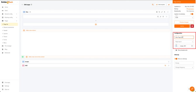 Na barra lateral, insira o nome da página, escolha o layout e escreva o caminho de acesso (URL) nos campos correspondentes.