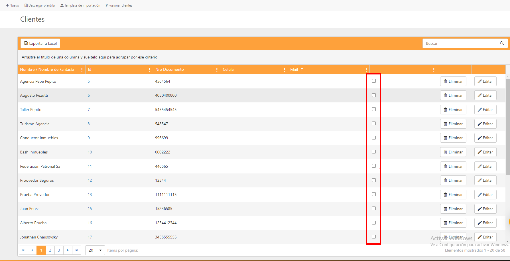 2. Uma vez dentro da lista de «Todos os clientes», veremos alguns quadradinhos como uma das colunas, onde poderemos marcar os clientes com um tick.