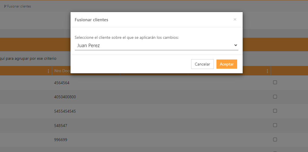 A função «Fundir clientes» serve para que, quando temos dois clientes com a mesma identidade, possamos fundi-los, para que essa informação não seja apagada e não interfira com os dados já carregados no sistema. Pode ser usada quando o sistema nos diz que já existe um cliente com os dados que estamos a carregar ou quando, sem querer, criamos dois clientes iguais.